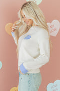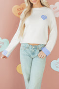 White Plaid Heart Embroidered Cuffed Drop Shoulder Crew Neck Sweater