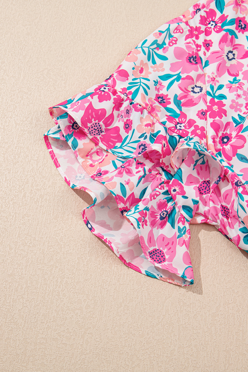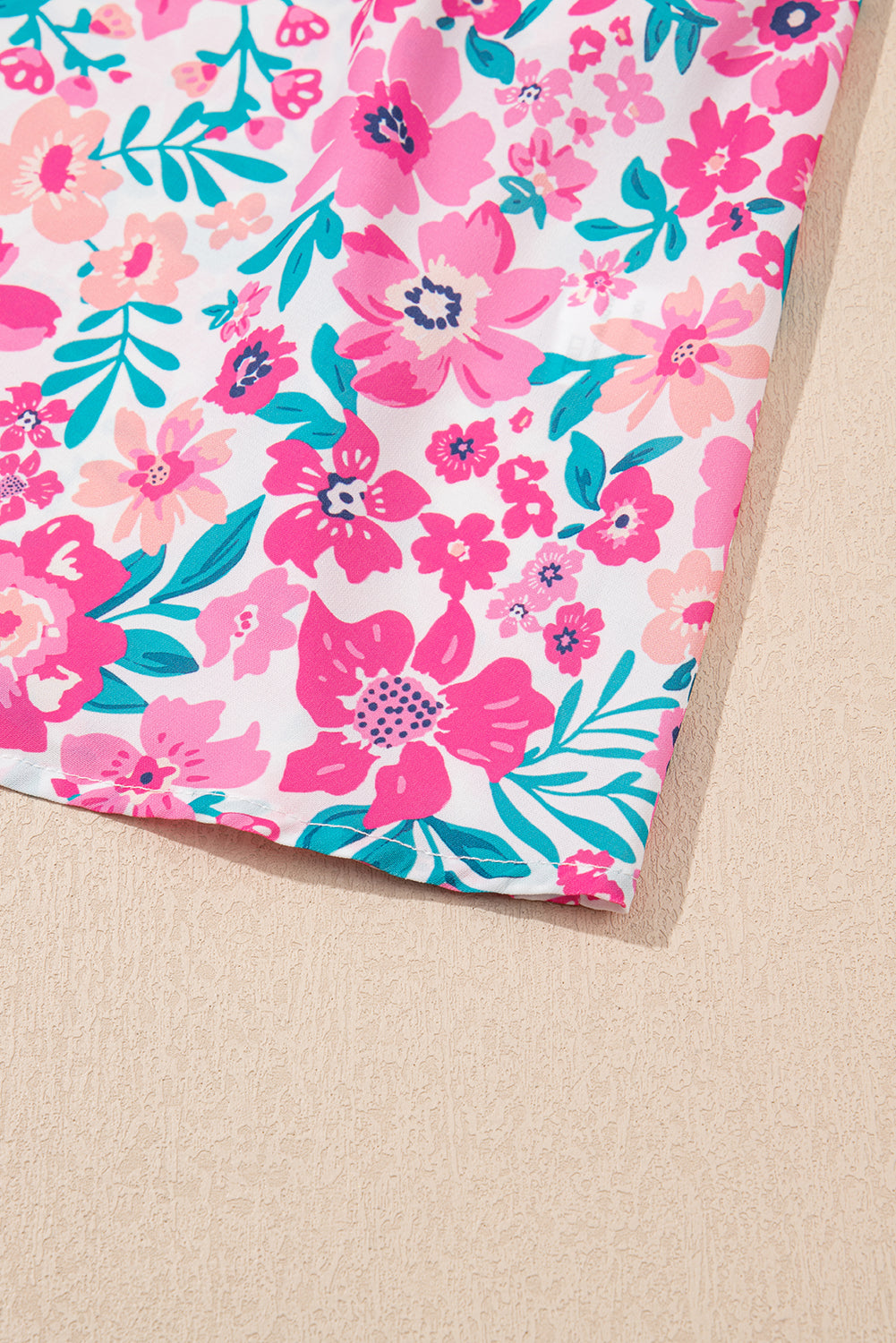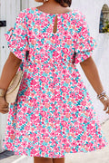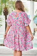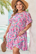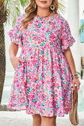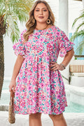 Sale Pink Plus Size Floral Half Button Short Puff Sleeve A-line Dress