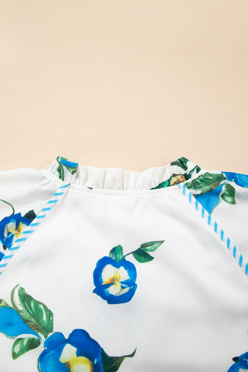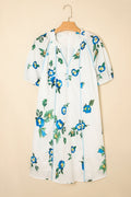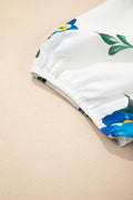 White Plus Size Floral Short Puff Sleeve Contrast Tie V Neck Dress