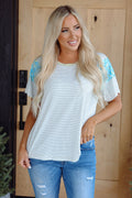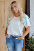 White Stripe Floral Insert Sleeves Contrast Round Neck Tee