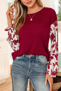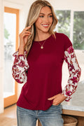 Wild Ginger Contrast Floral Sleeve Solid Ribbed Body Patchwork Long Sleeve Top