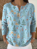 Christmas Tree Print Button Decor T-shirt, Casual Long Sleeve Plaid Print T-shirt