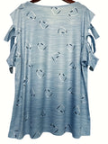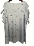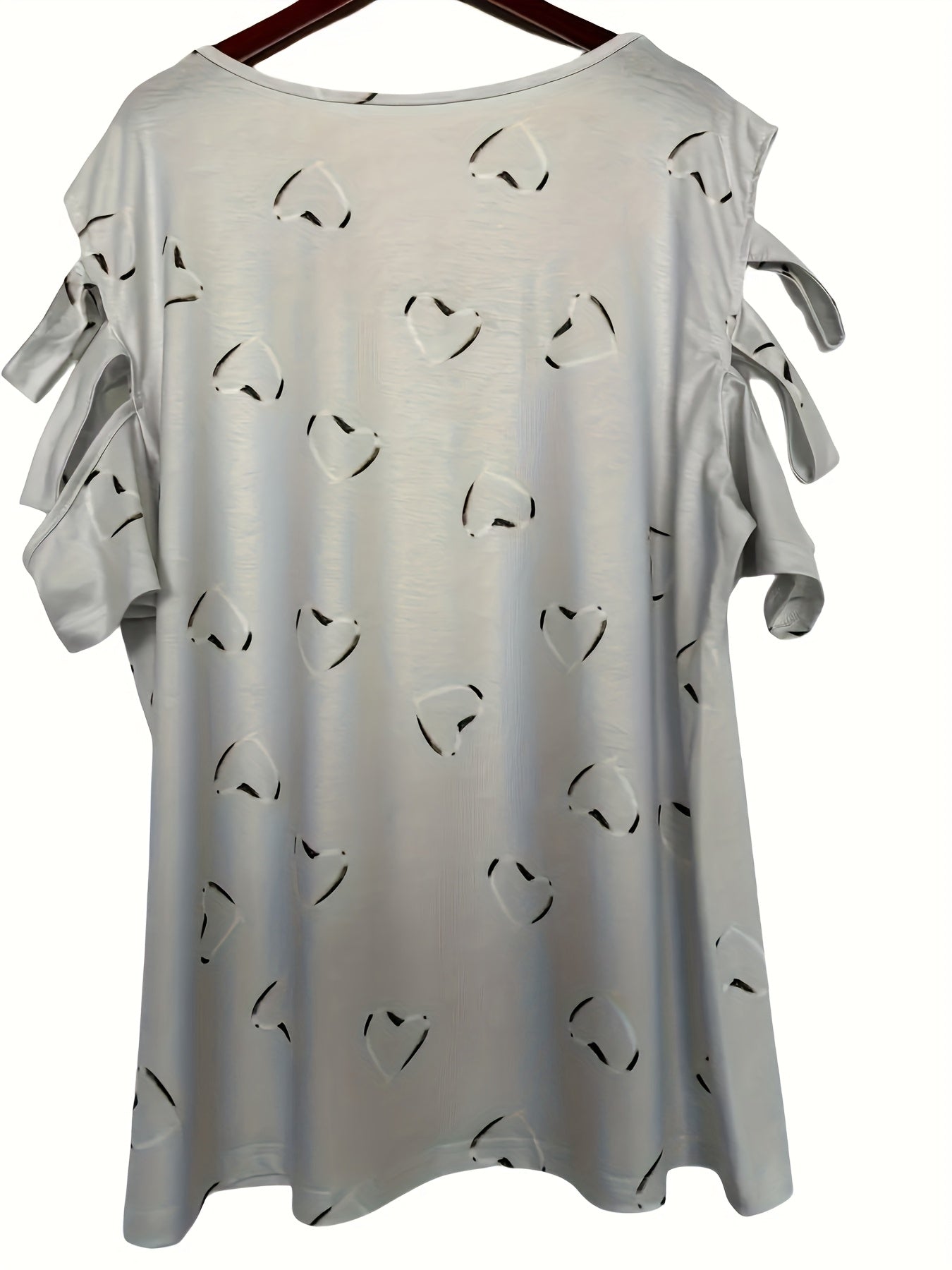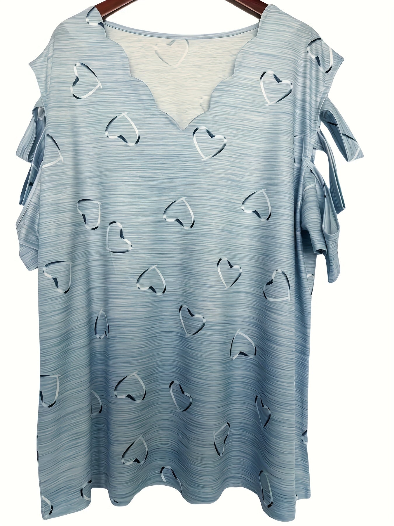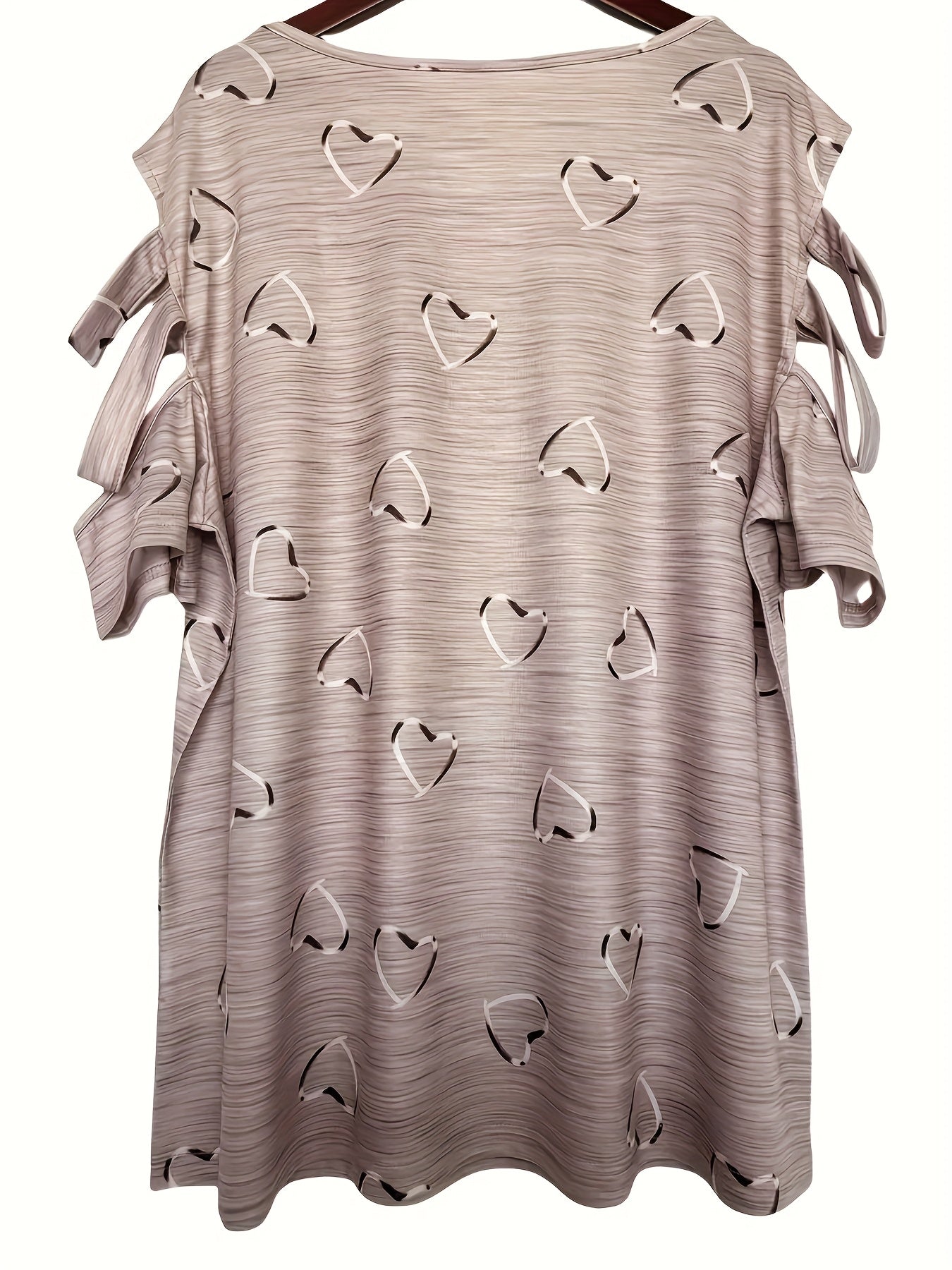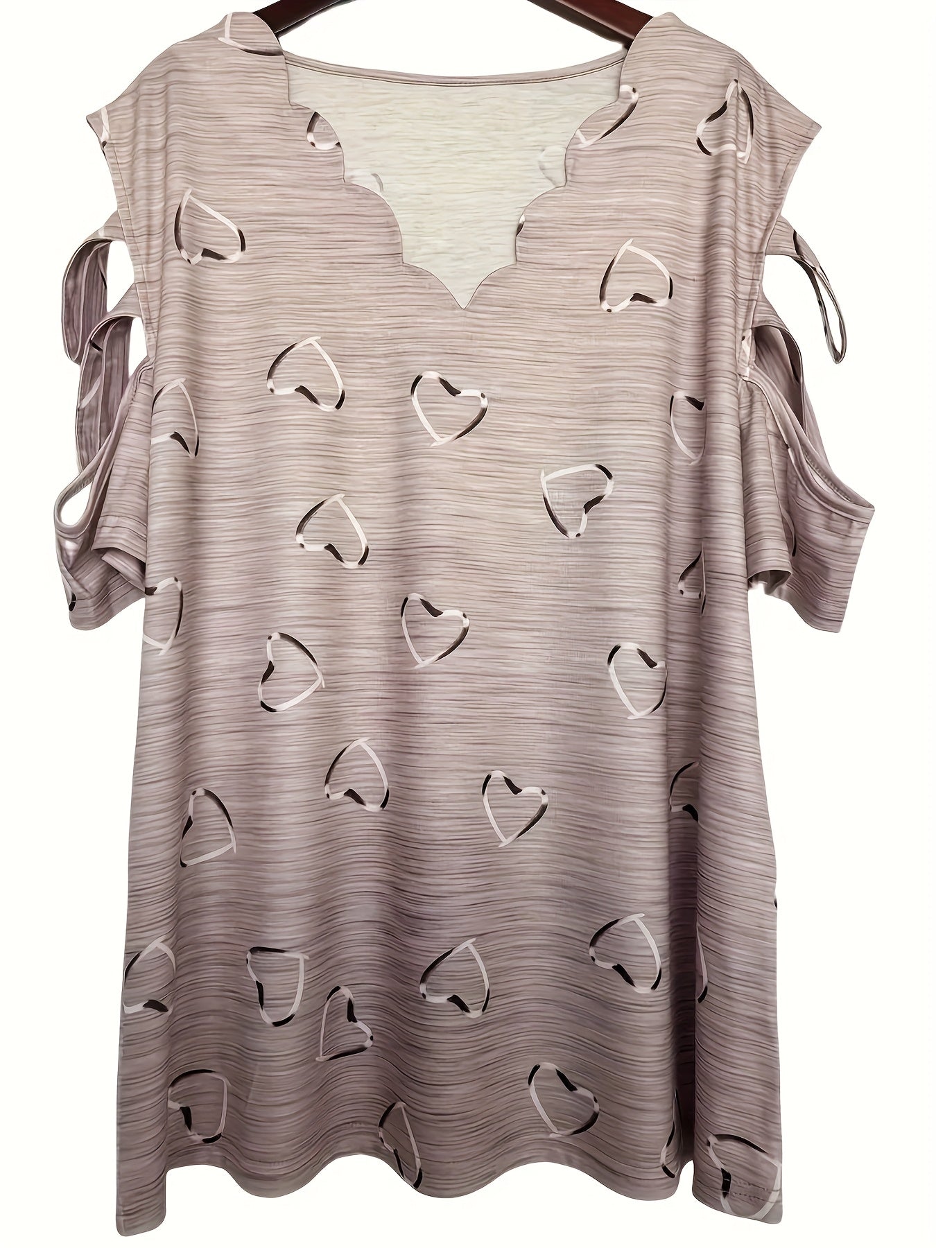 Short Sleeve Heart Print V-Neck T-Shirt with Cold Shoulder Design