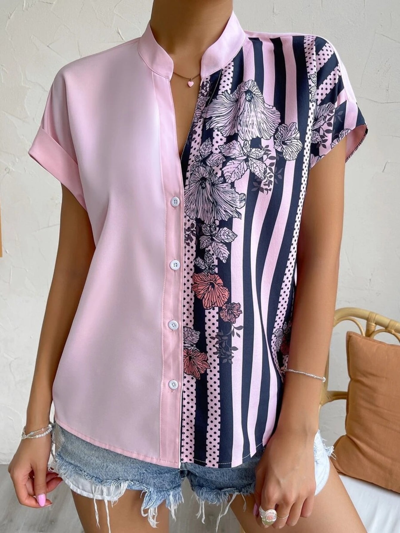 Women's Floral Print Contrast Blouse - Casual Cap Sleeve Collar Top for Effortless Style