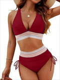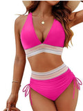 Women's High-Waisted Beachwear Set With Color Block Contrast Band Two-Piece Drawstring Swimwear