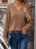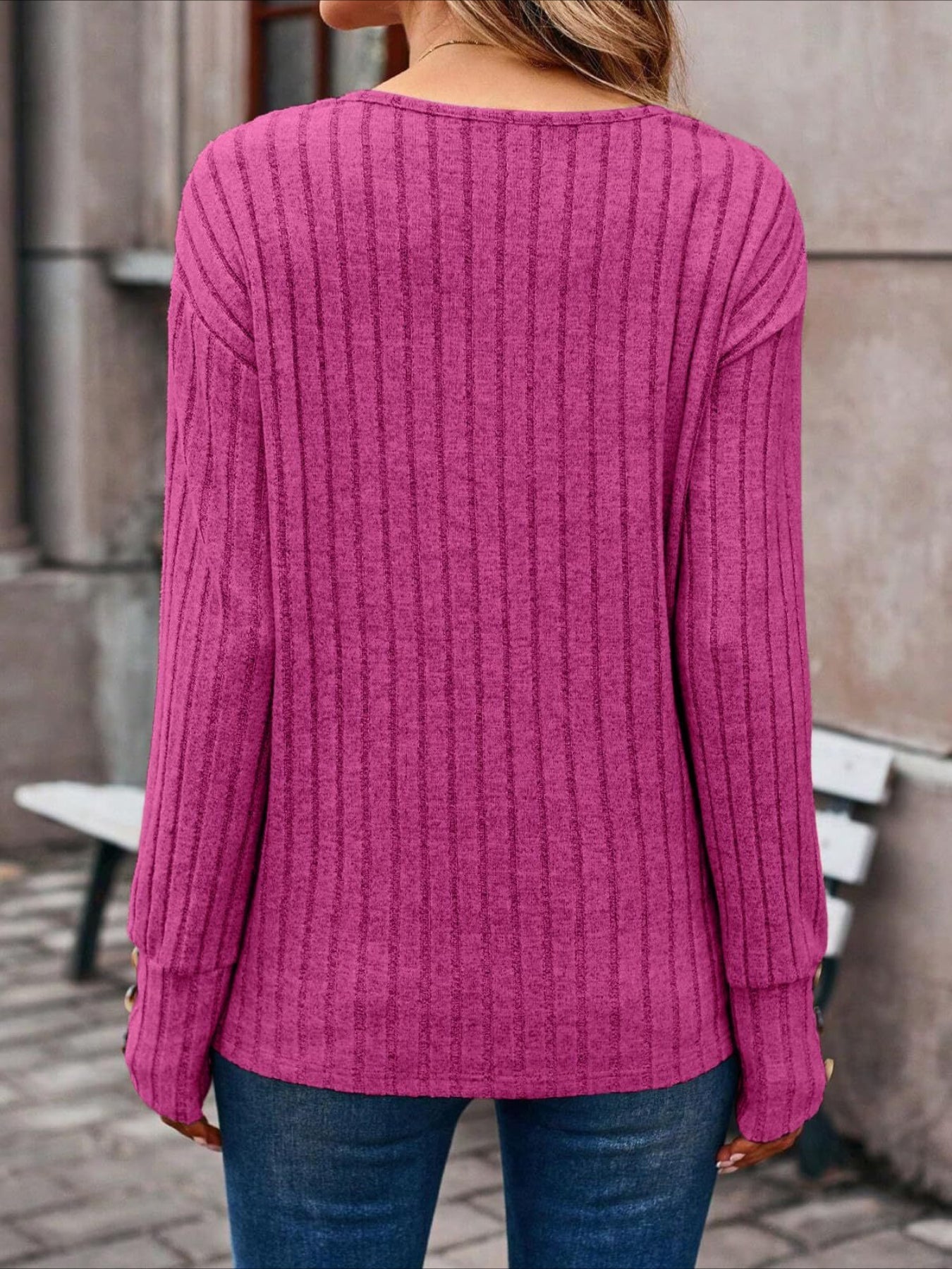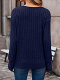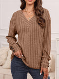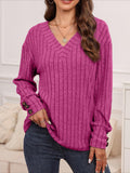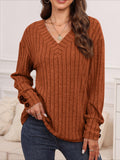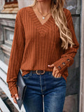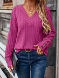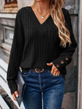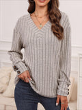 Womens Ribbed Button Detail T-Shirt - Fashionable V-Neck Long Sleeve Top