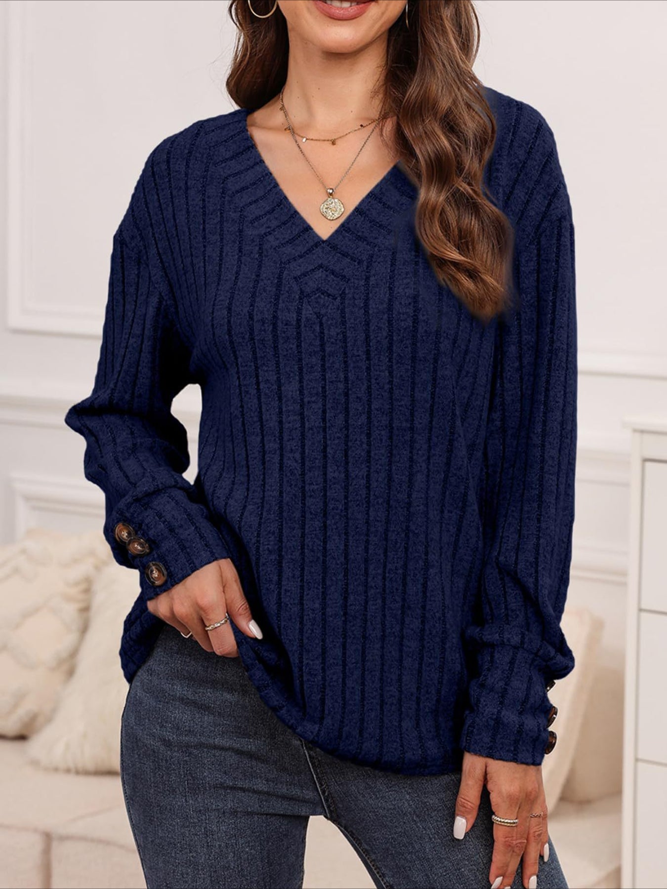 Sale Womens Ribbed Button Detail T-Shirt - Fashionable V-Neck Long Sleeve Top