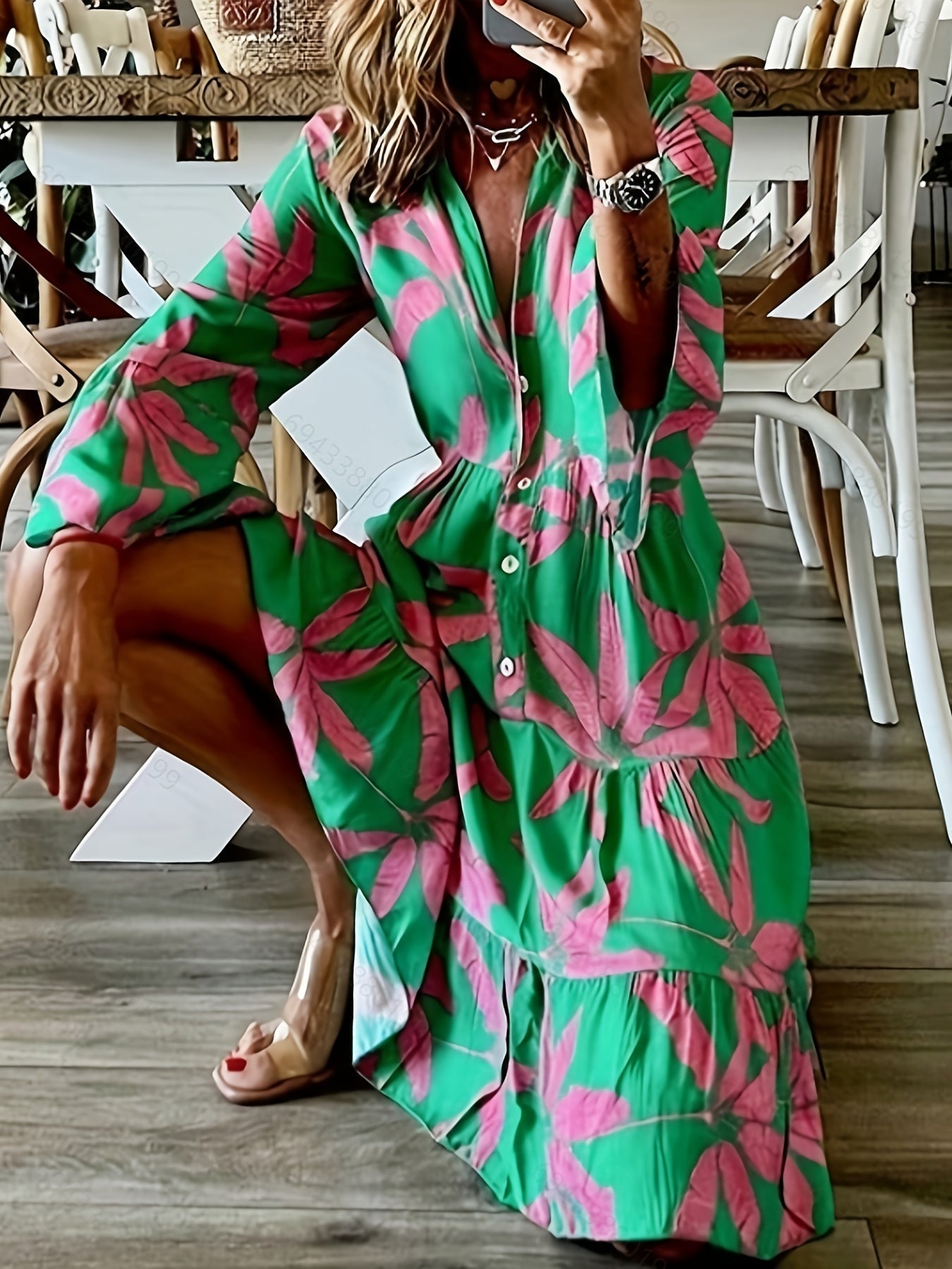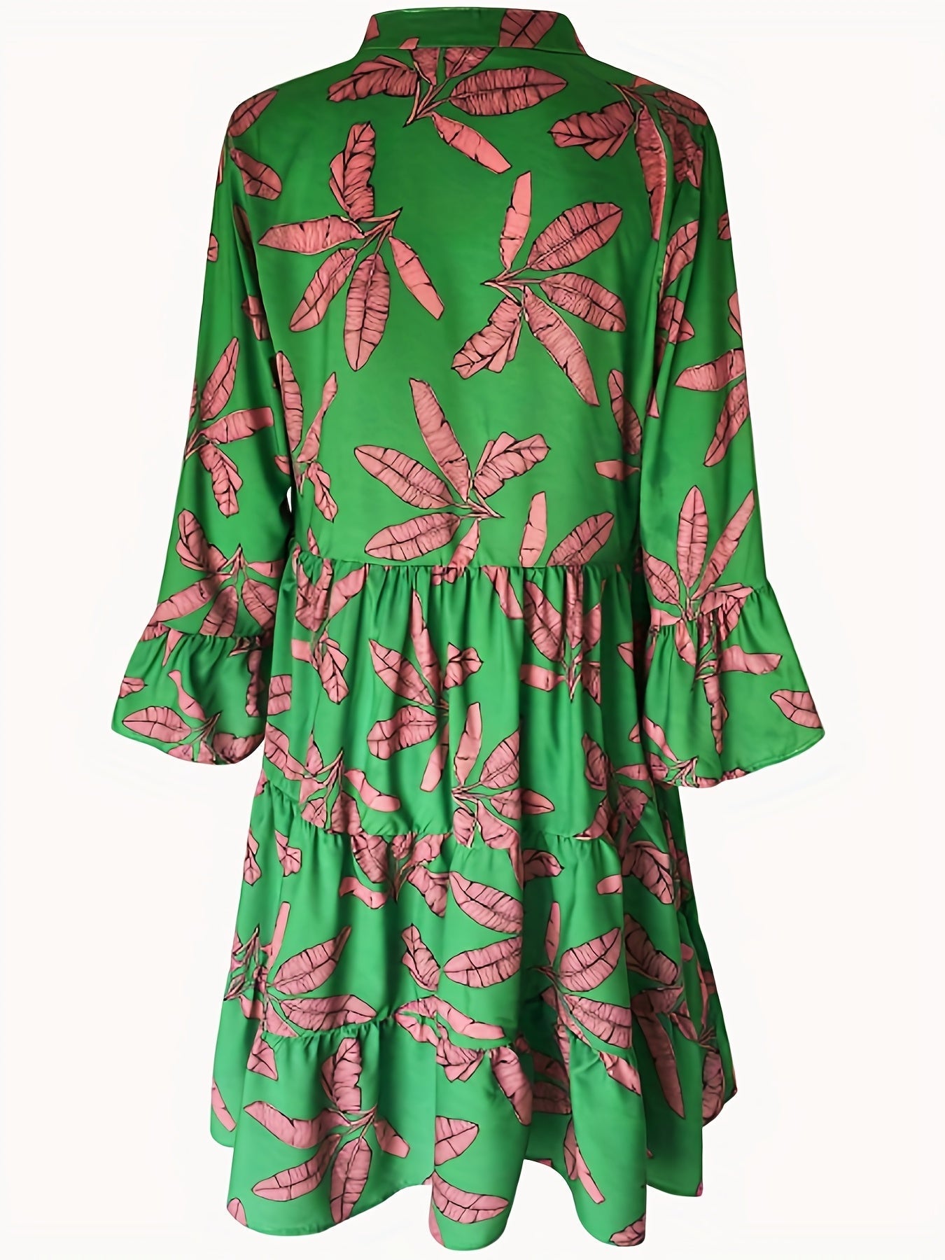 Sale Leaves Print Tiered Long Sleeve Dress