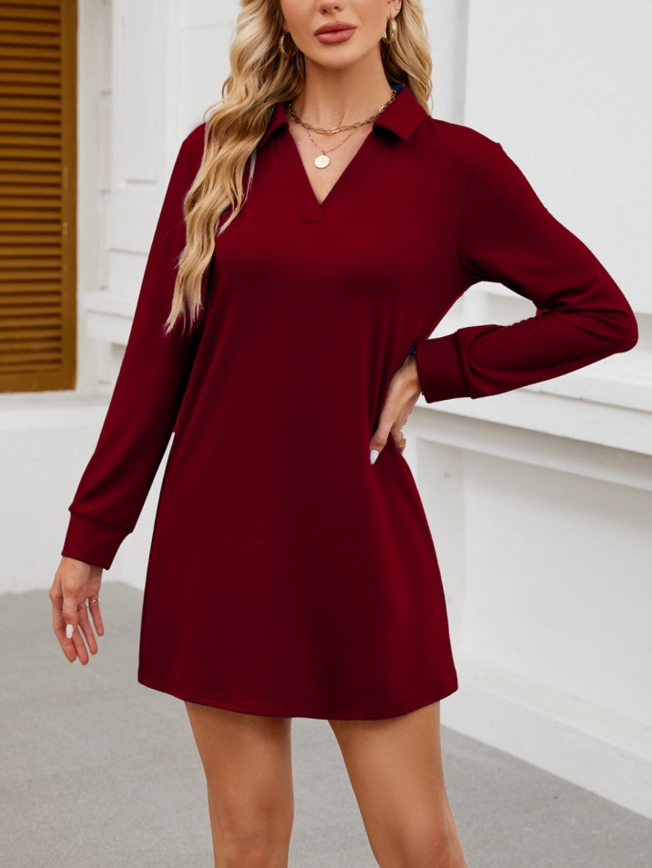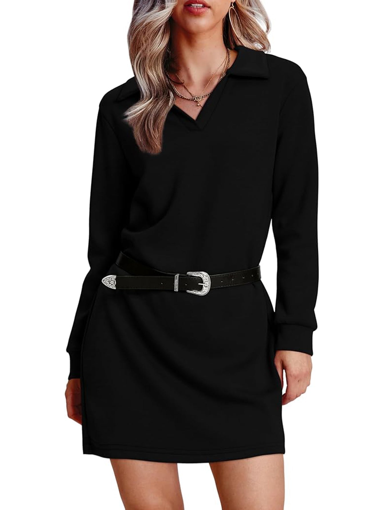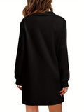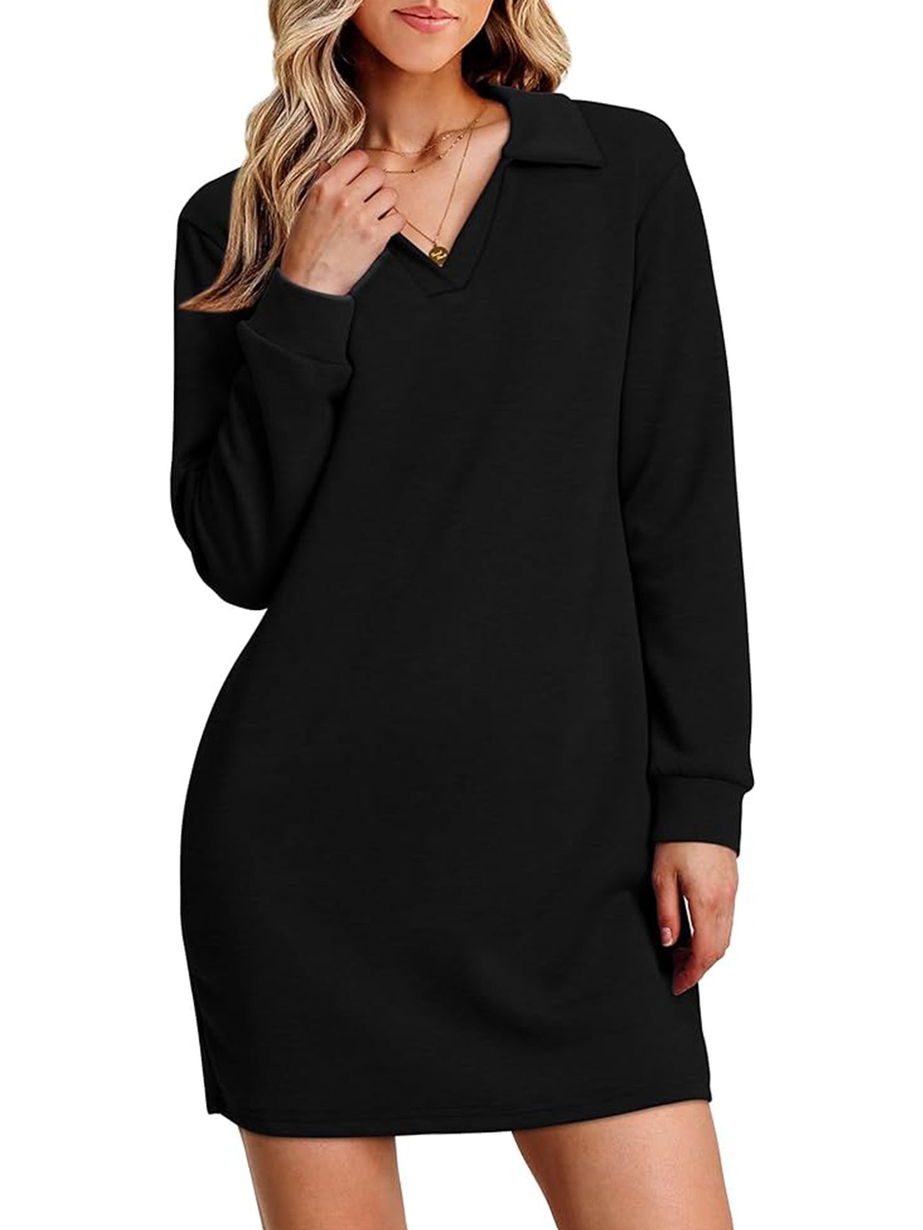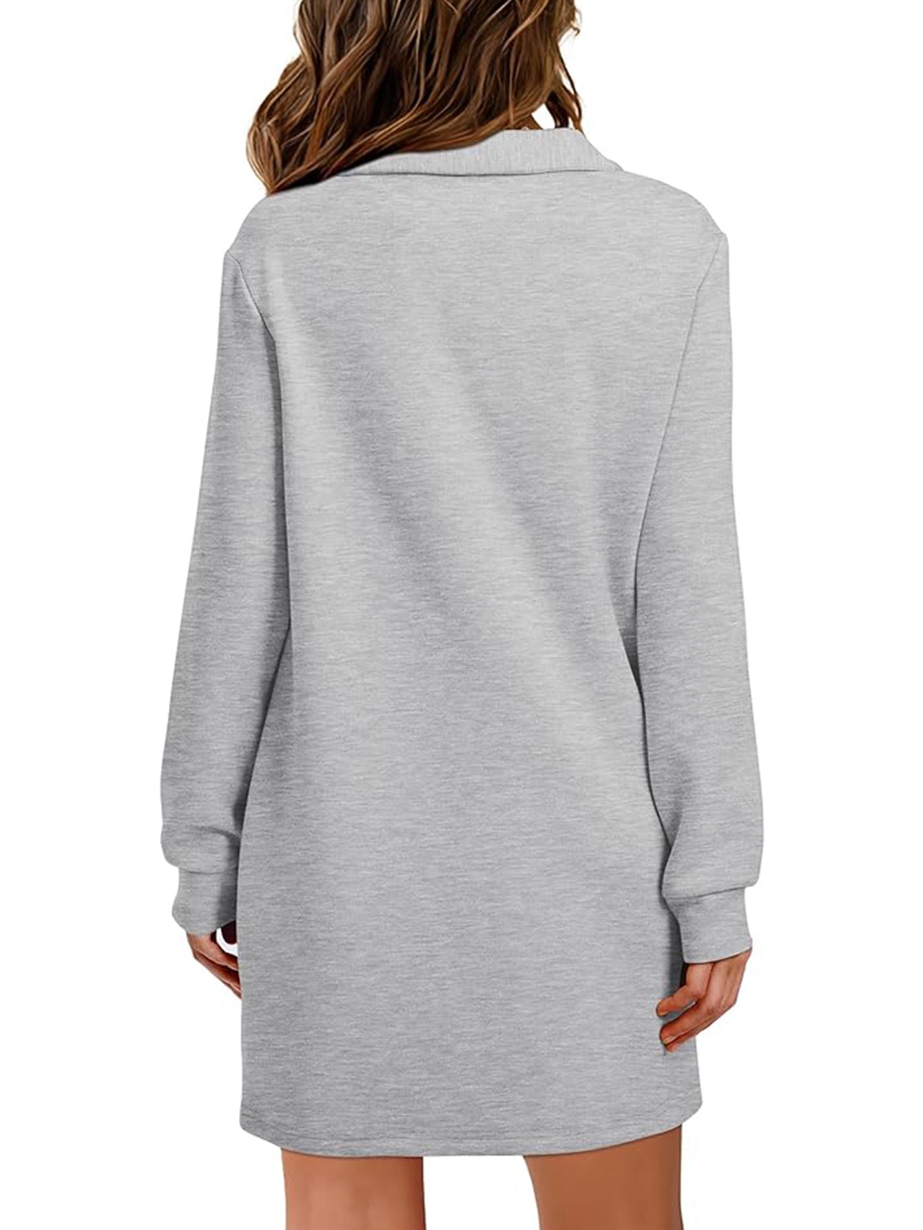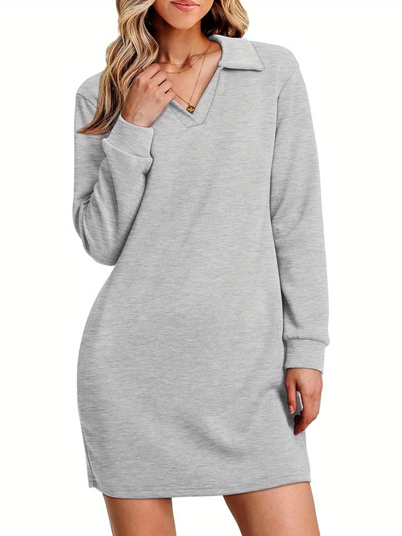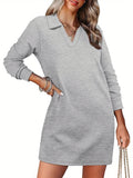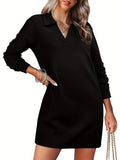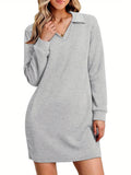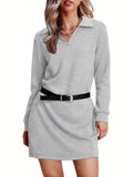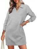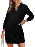 Womens V Neck Long Sleeve Lapel Collared Sweatshirt Dress Loose Fit Solid Color Mini Dresses