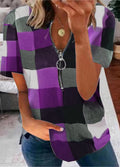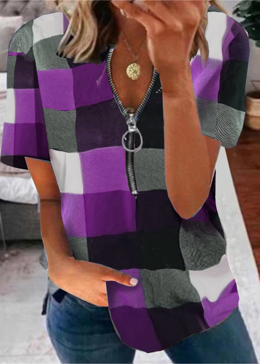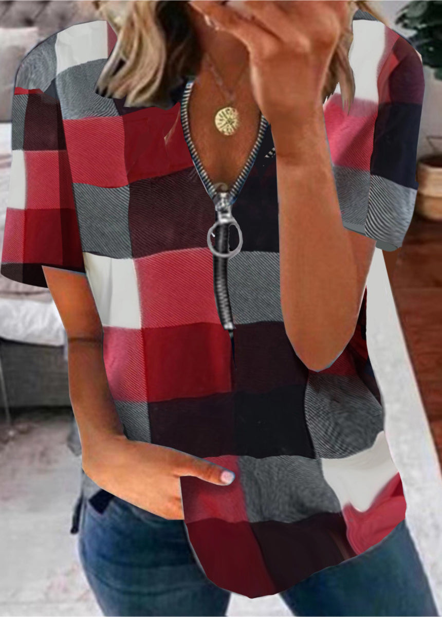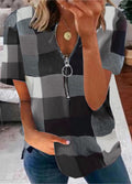 Sale Zipper Plaid Print Short Sleeve T-shirt
